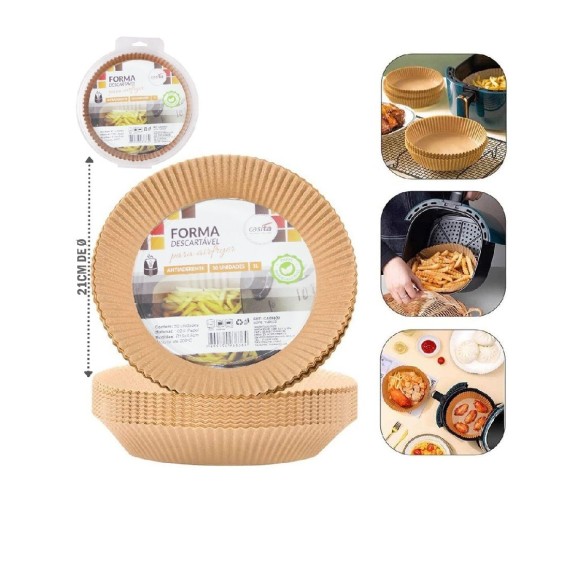 FORMA DE PAPEL REDONDA DESCARTAVEL PARA AIR FRYER 50 PECAS 21CM X16CM